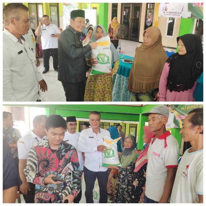 Plt Bupati Abah Subandi menyampaikan,” kita sudah melaksanakan pembagian beras yang ke lima kalinya tentu dengan program pemerintah diberikannya bantuan sembako bisa dimanfaatkan dengan sebaik-baiknya. Bantuan beras dari pemerintah ini dibuat kebutuhan sehari-hari jangan sampai nanti sudah pulang dari balai desa beras dijual atau ditukar dengan telor dengan nada bercanda dan tawa, ucapnya.
