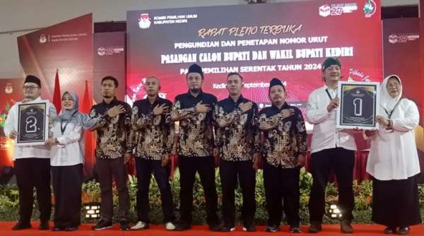 Kediri || expressnewstoday.net – Komisi Pemilihan Umum (KPU) Kabupaten Kediri menggelar Rapat Pleno Terbuka dengan acara penetapan nomor urut pasangan calon (Paslon) Bupati dan Wakil Bupati Kediri untuk Pemilihan Kepala Daerah (Pilkada) Tahun 2024, di Gedung Bhagawanta. Senin, 23/09/24.